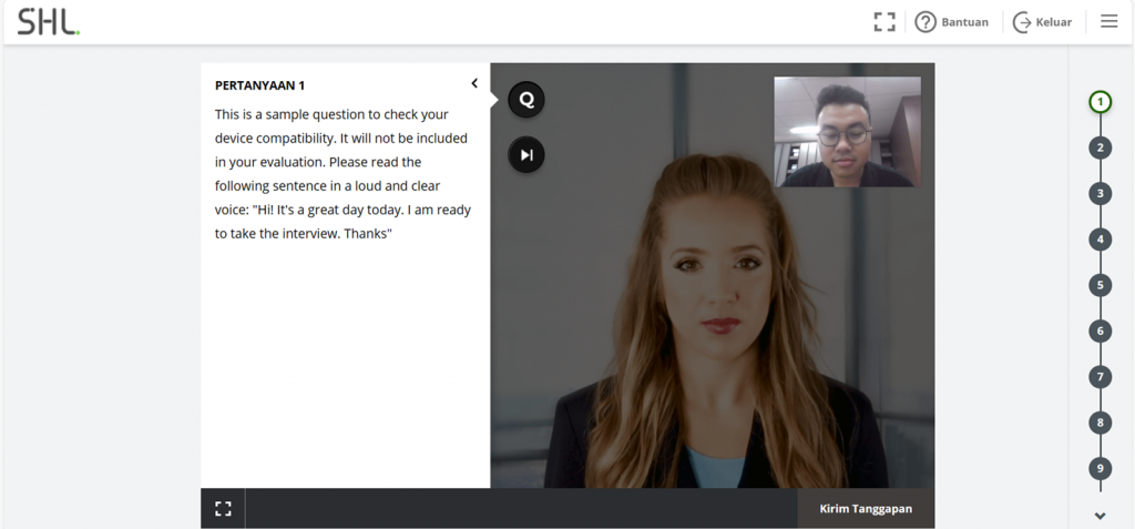 Pertanyaan 1 merupakan contoh soal, silahkan membaca petunjuknya dan beri tanggapan dengan mengucapkan kalimat “Hi it’s a great day today, I am ready to take the interview. Thanks”.